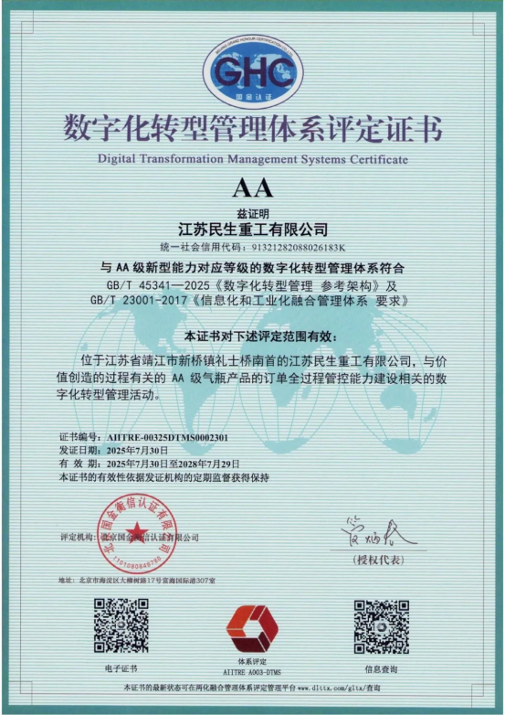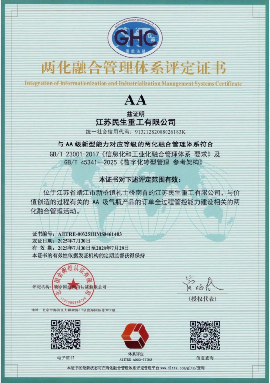 近日,江蘇民生重工有限公司(以下簡稱“民生重工”)順利通過了工業(yè)和信息化部兩化融合管理體系評定工作委員會的審核,榮獲《兩化融合管理體系A(chǔ)A級評定證書》及《數(shù)字化轉(zhuǎn)型管理體系A(chǔ)A級評定證書》。此次雙認(rèn)證標(biāo)志著民生重工在智能制造與信息化深度融合領(lǐng)域?qū)崿F(xiàn)里程碑式突破,為民生重工數(shù)字化轉(zhuǎn)型和管理體系的提質(zhì)增效提供了實踐范本。